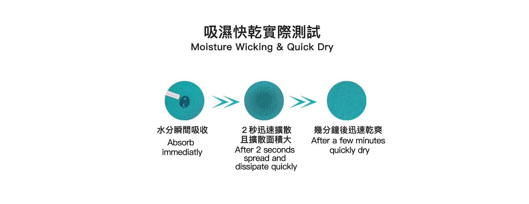商品經過 3M SCOTCHGARD™處理,可以讓衣物更快乾、吸濕排汗、良好的透氣度與有效隔離髒污等功能性。經測試證明,吸水速度快、擴散快,在通風處,能短時間達到乾爽,使穿者無論是在室內或是戶外都能感受到布料的乾爽舒適。更重要的是,布料的手感、外觀與柔軟度不因處理3M COTCHGARD™而有所改變,且技術整合至織物中,不隨洗滌減退,效果具永久性。
