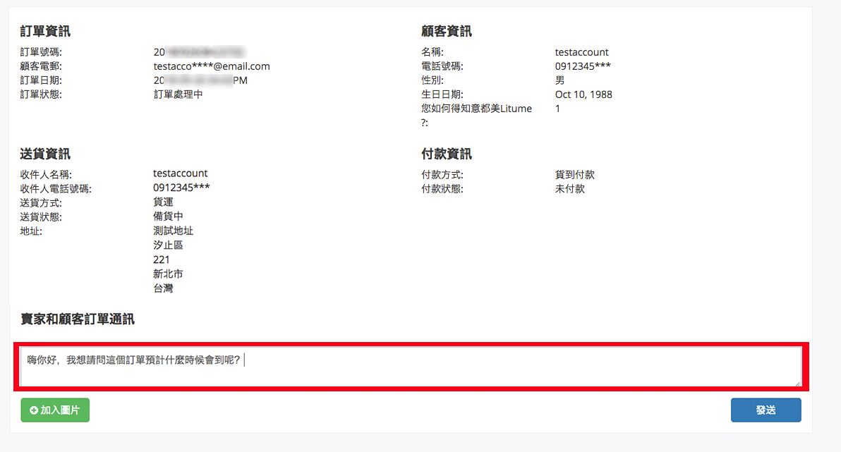 在訂單資訊頁面下面的對話筐內輸入您想要說的話並『發送』