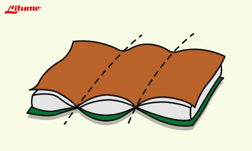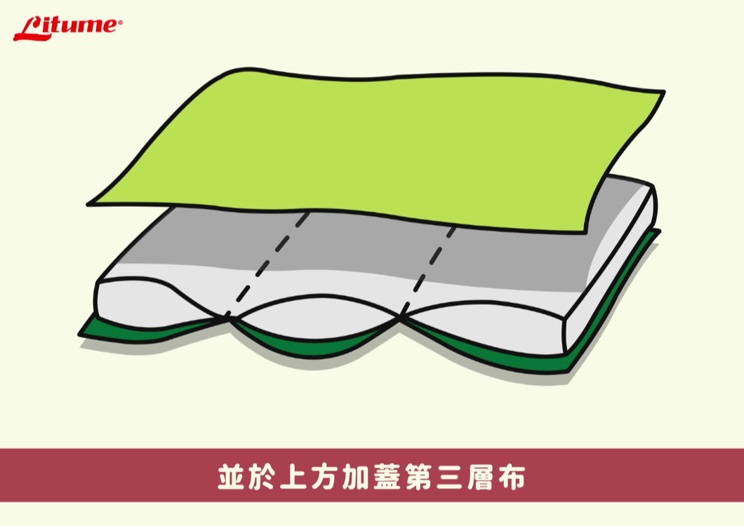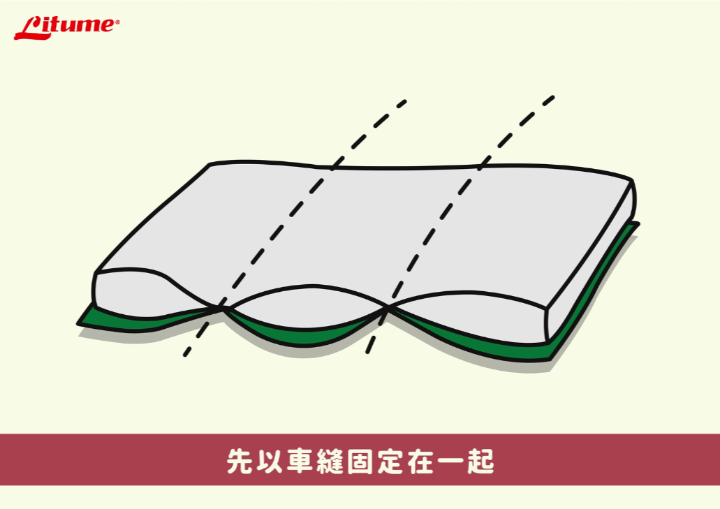 絎縫工法隔間的製程,與一般睡袋不同的地方就是,在製成時,我們會先將一層布與中間的填充物先行車縫固定,再將第三層布蓋上另外固定,而非三層布與填充物全部一起固定的方式。如下圖