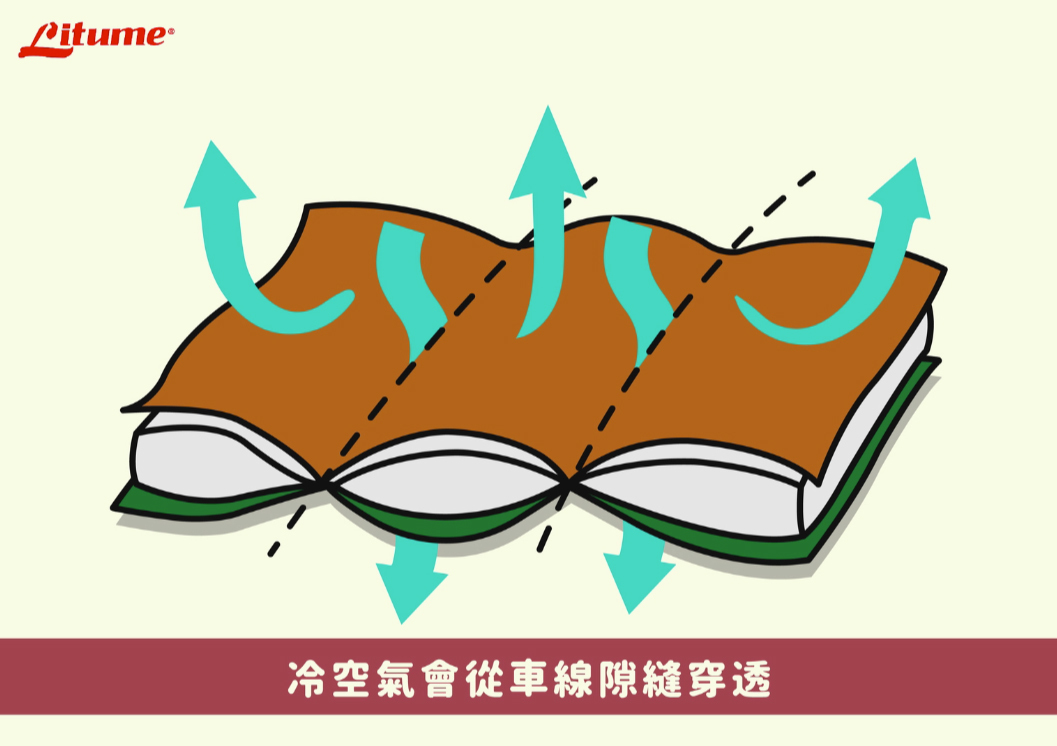 這時問題就來了,當這三層車縫在一起時,在車縫處就會產生隙縫,而冷空氣或冷風就會從這個縫隙跑進去,無論填充物是多保暖的材質,保暖效果都會大大被降低。