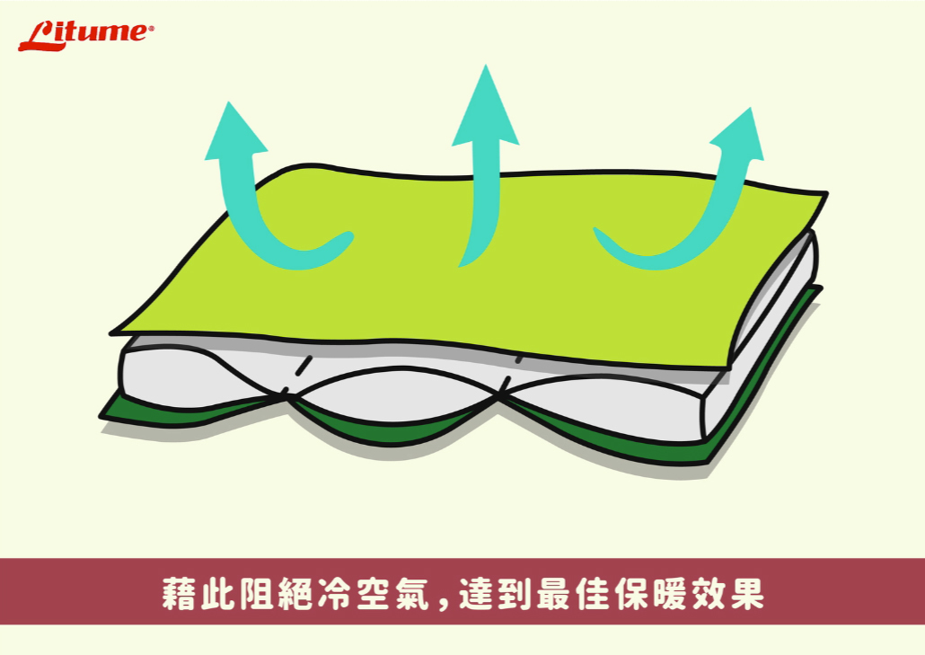 而在製程上,此種工法比起一般睡袋就需要多費一道工來去固定第三層布,但卻可以非常有效的阻絕冷空氣,達到最佳的保暖效果,睡得更舒適!